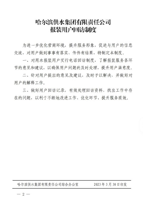 关于印发哈尔滨供水集团有限责任公司报装用户回访制度的通知