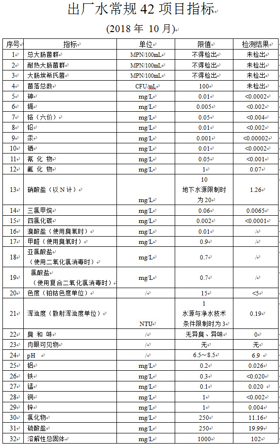出厂水常规42项目指标 (2018年 10月)