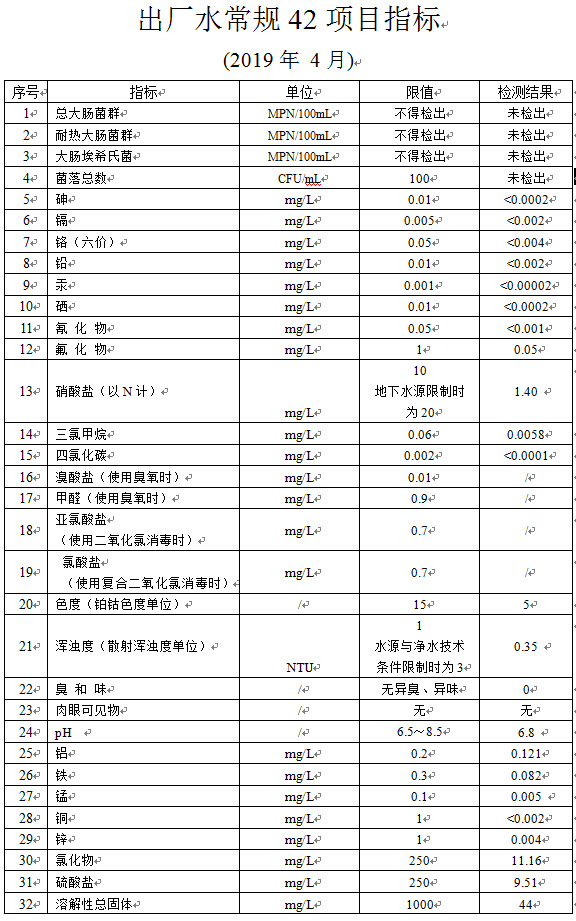 出厂水常规42项目指标 (2019年 4月)