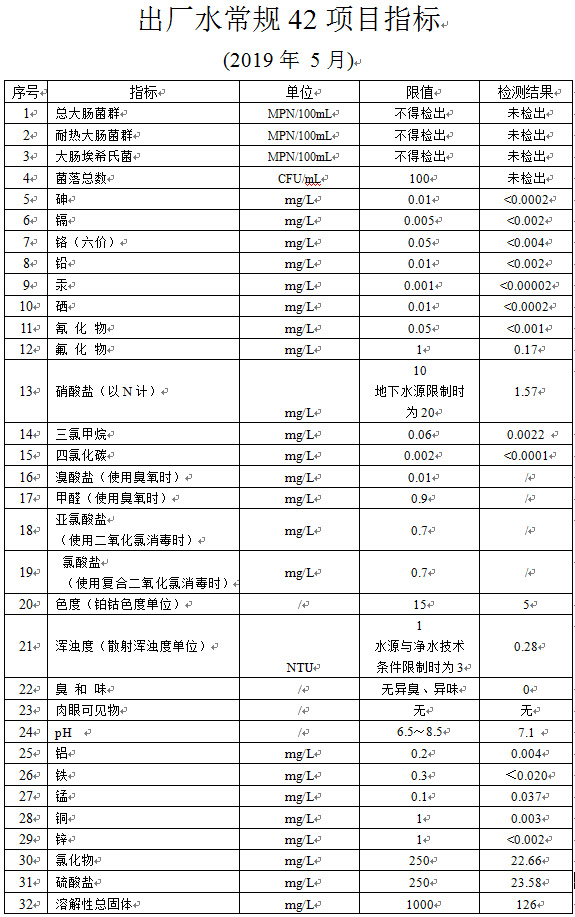出厂水常规42项目指标 (2019年 5月)