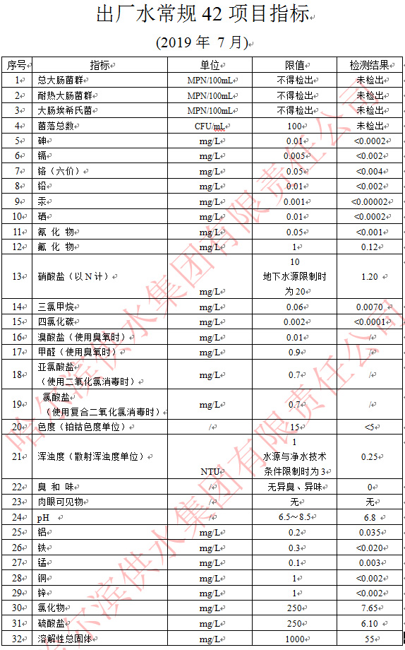 出厂水常规42项目指标 (2019年 7月)